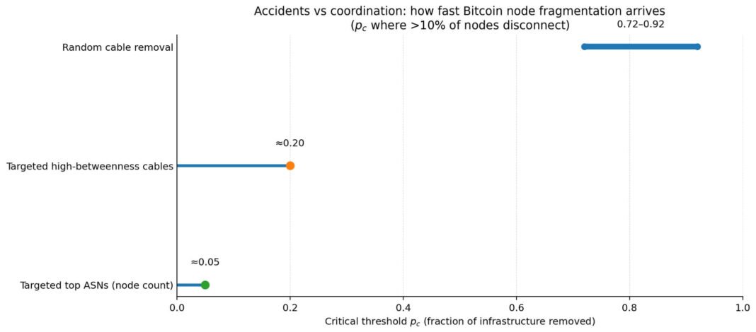 Under random cable removal, the critical failure threshold, at which more than 10% of nodes disconnect, lies between 0.72 and 0.92. Most inter-country cables must fail before Bitcoin experiences meaningful fragmentation.