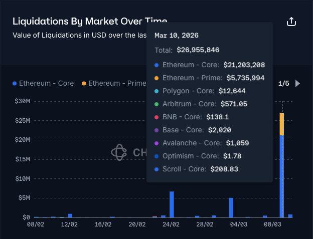 A misconfigured Oracle system in Aave triggered $27 million in forced liquidations on March 10, undervaluing wrapped staked Ether by 2.85% against its actual market rate.