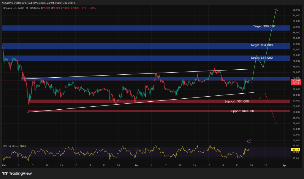 Bull case: reclaim $72,000, consolidate, retest the March high at $75,620. Bear case: rejection at $71,800 sends price back to $68,500. Lose that and $65,000 opens up.