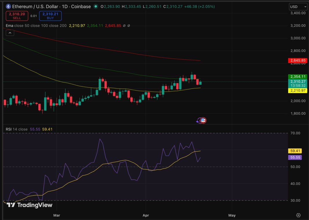 ETH sits at under $2,300, pinned inside a symmetrical triangle pattern with resistance clustered between $2,200 and $2,400. The RSI reads neutral, with volatility running at 5.21%, and 17 of the past 30 days closing green. Ethereum is coiling.