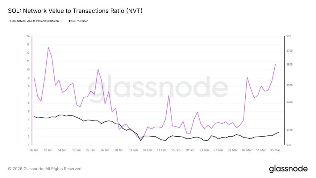 The NVT ratio is spiking. Price is rising while transaction volume lags behind. That divergence has a history of preceding corrections or stalled rallies.