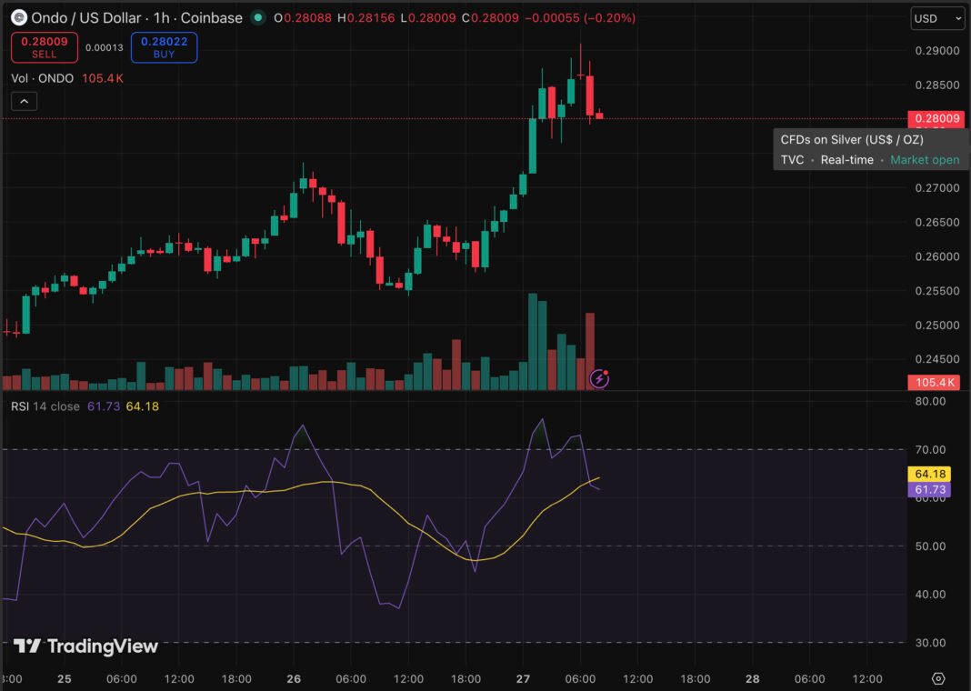 Ondo Finance just landed one of the heaviest institutional co-signs in tokenized finance history, and trading at $0.28 and posting a staggering 10% price jump in 24 hours as its prediction gets bullish.
