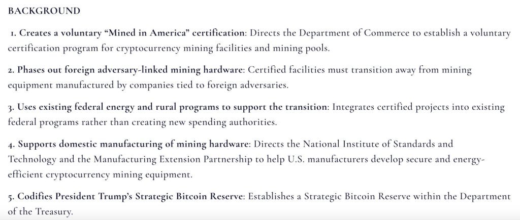 - Reserve Pipeline: The bill codifies Trump’s Strategic Bitcoin Reserve and creates a mechanism for certified U.S. miners to sell newly mined BTC directly to the reserve in exchange for capital gains tax exemptions.