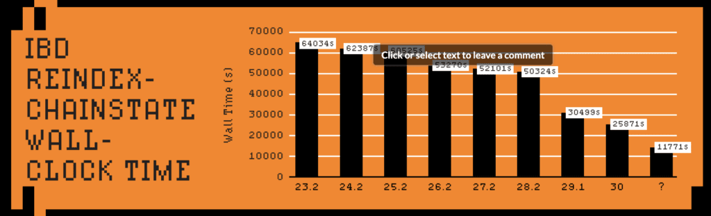 We’re also regularly benchmarking the IBD process. This can be done by reindexing the chainstate and optionally the block index from local block files, or doing a full IBD either from local peers (to avoid slow peers affecting timings) or from the wider p2p network itself.